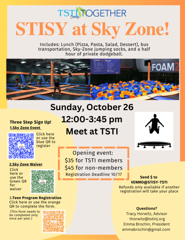STISY (Sharey Tefilo-Israel Senior Youth) is a teen-run youth group with monthly outings for 9-12th graders. This is a great opportunity to meet other Jewish teens, help the larger community, and learn more about Judaism.