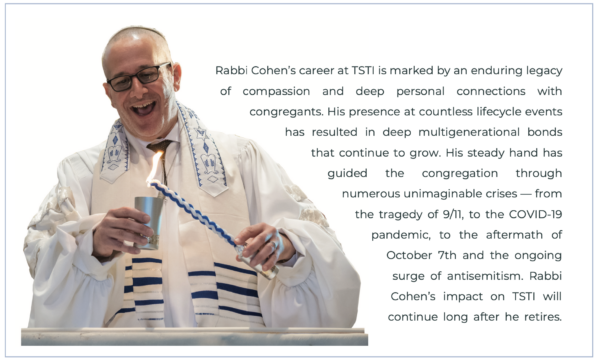The goal of the TSTI Tomorrow Campaign is to honor Rabbi Cohen’s legacy while building the financial stability needed for the synagogue to remain resilient and innovative in the midst of an increasingly polarized world.